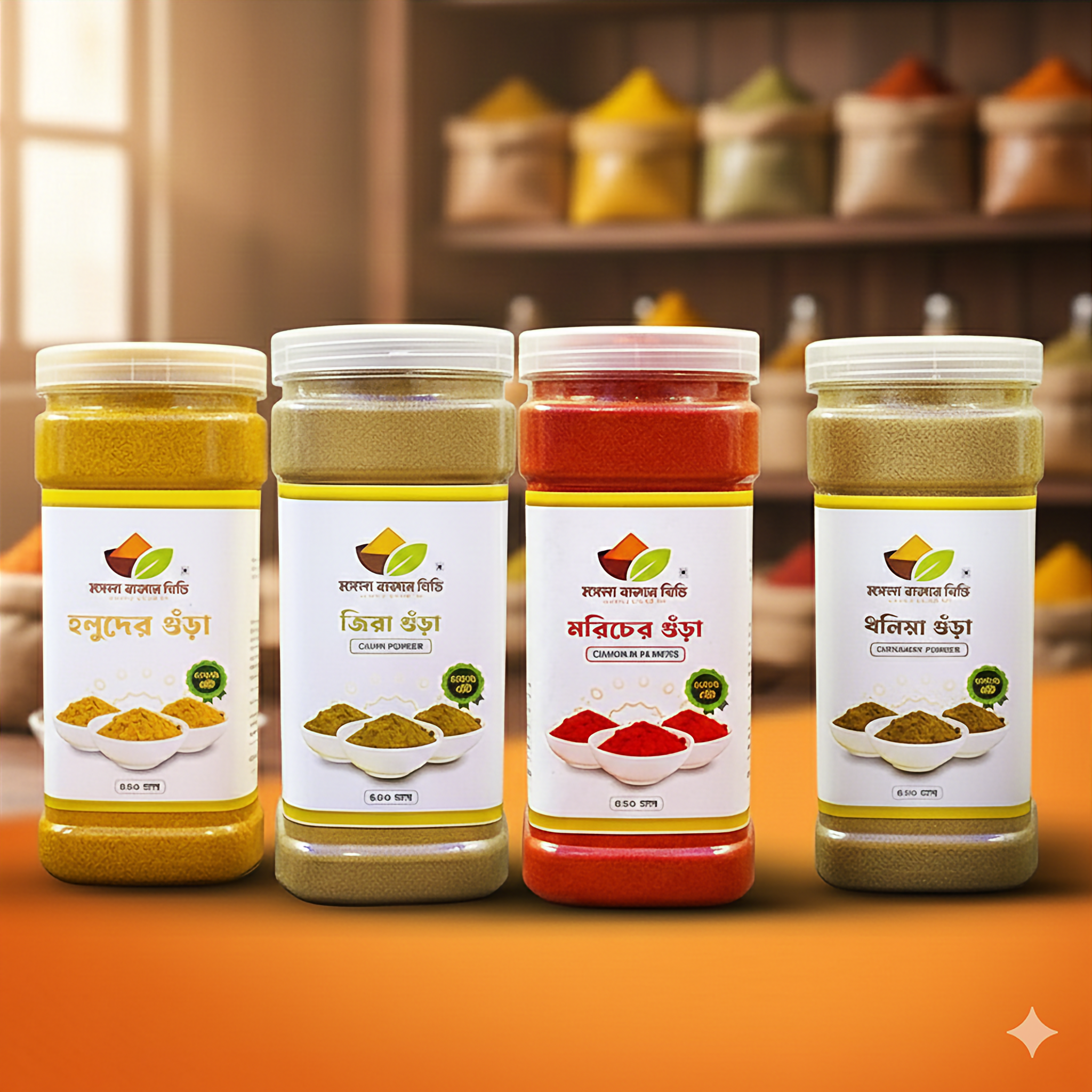 হলুদের গুঁড়া: গ্রামের কৃষকের থেকে ক্রয় কৃত হলুদ শুকিয়ে পরিষ্কার পরিচ্ছন্ন পরিবেশের গুঁড়া করা হয়।